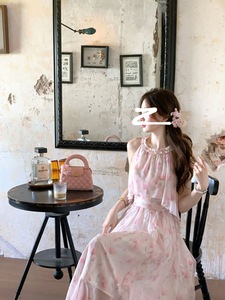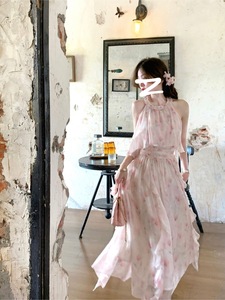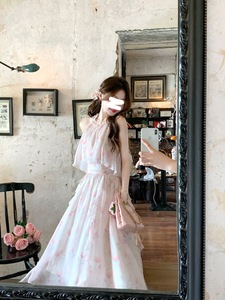フレンチスタイルのロングオフショルダーホルターネック花柄ドレス春の純粋な欲望スタイルウエスト痩身プリンセスフェアリードレス