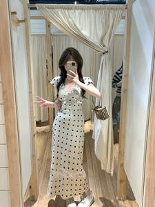 スカート夏の女性の 2025 新しいハイエンドウエスト気質ロングスカートフレンチサテン水玉半袖ドレス
