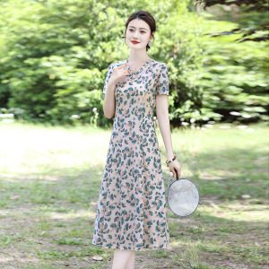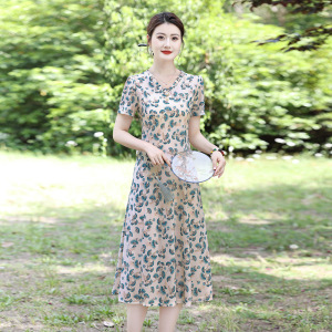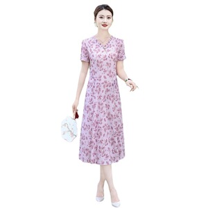 2025 新しいドレス半袖ドレスファッショナブルな新しいプリント花柄大きいサイズお腹カバー痩身ミドル丈スカート