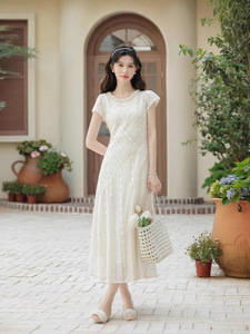 新しいアイスカイミドレス女性のレースステッチノースリーブドレス女性のスリム気質 A ラインロングスカート夏新