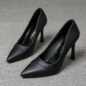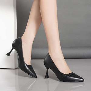 2025春新款真软皮尖头细跟高跟单鞋女黑色中跟职业工作上班鞋