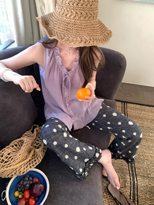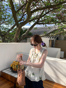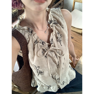 松麗茶語(ソン・リ・チャ・ユ)麻麻耳(ママオ)刺繍入りVネックノースリーブトップス、女性用、紐付き、フリル付き、ゆったりとしたブラウス
