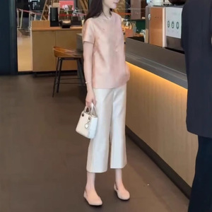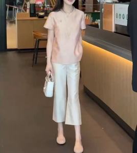 25536 Daai Mei Yuan 2025 夏新ピンク中国風ルーズトップハイウエストストレートパンツ女性のための
