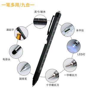ライト栓抜き付きクロスボーダー多機能ツールペンタッチスクリーンペン水平スケール金属ボールペン9イン1