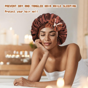 クロスボーダー熱売二重色丁寝帽リボン付女性円帽両面に広辺蝶結びのヘアケア帽子をかぶっています。