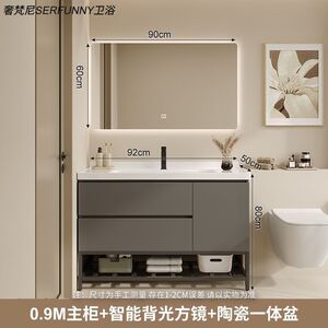 N ファッショングレー-普通ミラーキャビネット-フルミラー-90床置き-多機能招き猫蛇口