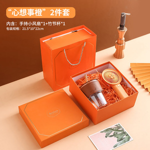 C8-扇子+竹カップ+タオル[オレンジギフトボックス+ギフトバッグ]