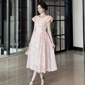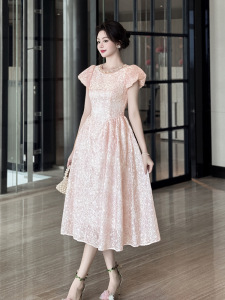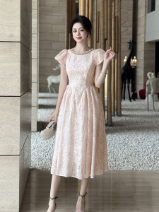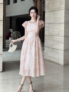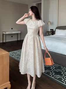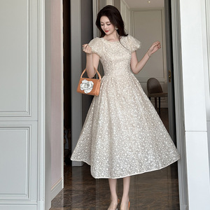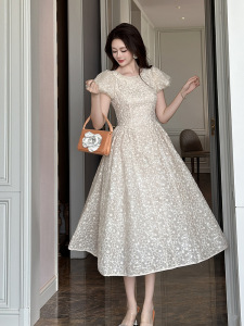 2025夏のフランスのリゾート風の泡の袖の大きい振り子のレースのワンピースの甘い気質は腰の長いスカートの45147を収めます。