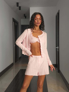 2025 ヨーロッパとアメリカの春ピンクニット快適な長袖サスペンダーショーツ新しいパジャマ女性のホームウェアセット卸売