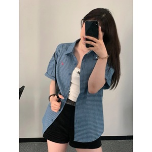 2025夏の青い格子の半袖のシャツの女性の韓国系のゆったりとしたカジュアルなシャツのレトロな香港風の刺繍の上着のコート