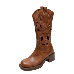 刺繍入りレトロウエスタンカウボーイブーツ中空夏薄いロングブーツ女性の夏通気性ファッションブーツミッドカーフナイトブーツ