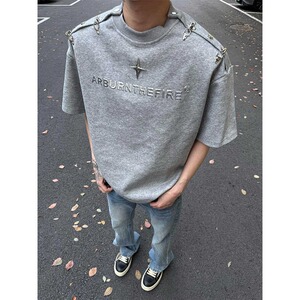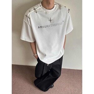 アメリカンハイストリートスモールネックライン肩パッドTシャツメンズ夏のファッションシンプルなハイエンドハンサムルーズ半袖トップ