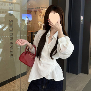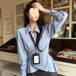 韓国ファッションウエストカラーシャツレースアップリボンデザインスリム新作長袖ストライプイレギュラートップ