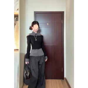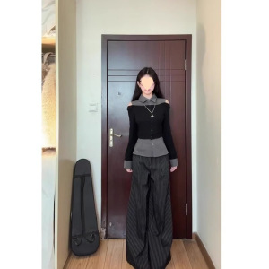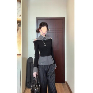 春アメリカンレトロコントラストカラーステッチ偽ツーピースシャツ女性のための春の新しいニッチウエストスリムオフショルダートップ
