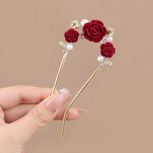 新しい中国風の赤いバラ U 字型ヘアピン中国風の古代スタイルのチャイナドレス花嫁乾杯ドレスヘアアクセサリー中国風のジュエリー