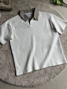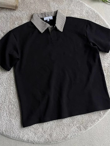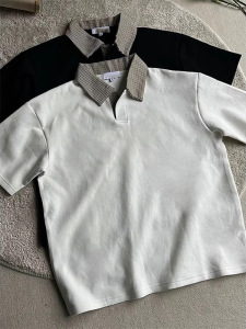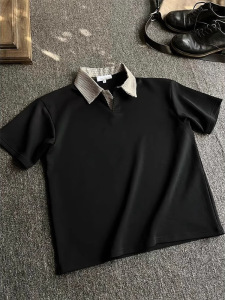 千鳥格子パッチワークポロシャツ半袖メンズアメリカンオールドマネースタイルショルダーTシャツクリーンフィットラペルハーフスリーブ