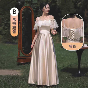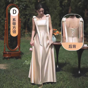 新しい2025ブライズメイドドレス、ウェディングサテンスリムドレス、卒業式用エレガントロングドレス、シャンパンカラー、Aライン