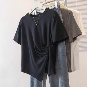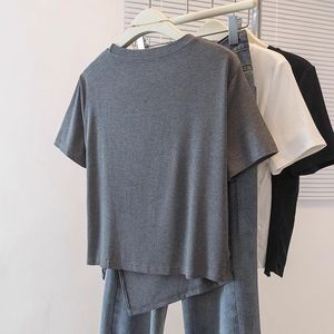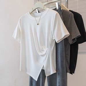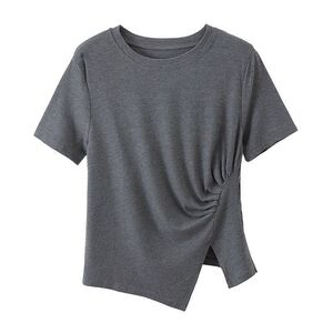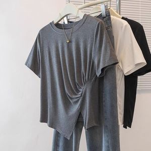 不规则灰色正肩短袖T恤女2025夏季新款大码胖mm褶皱小衫短款上衣