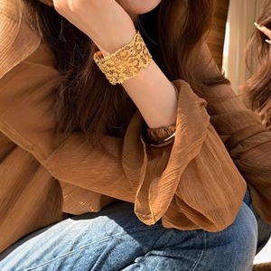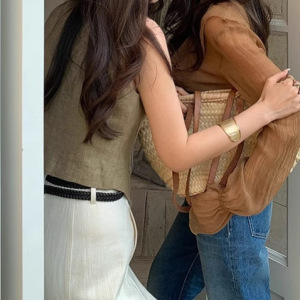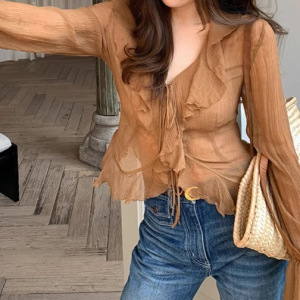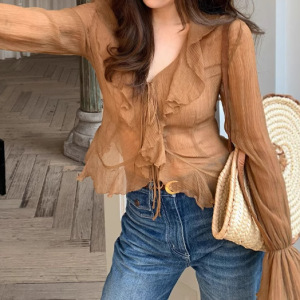 2025 フレンチセレブスタイルの新しいスタイルのVネック中空ランタンスリーブシャツはわずかに透けて夏のスリムフィットの女神スタイル