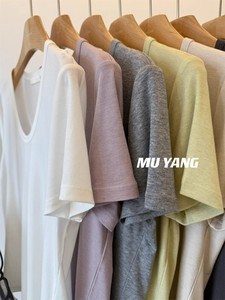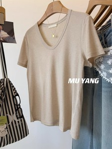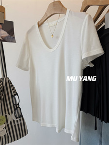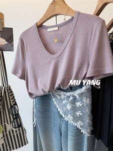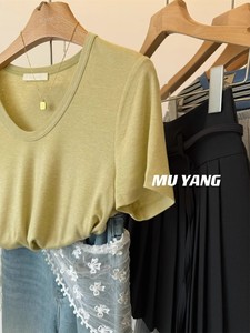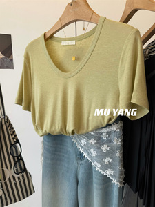 2025夏のシンプルなuネックのライセルウール半袖の下のtシャツの女性の純色の百合teeの肩の上着ins