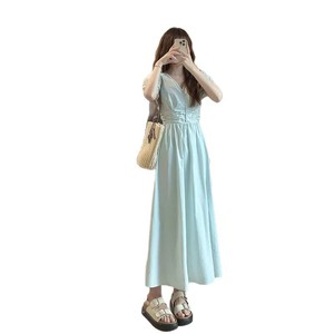 青いフランスvネックの泡袖のしわのワンピースの女性の夏の2025新型の気質は腹を遮ってやせている長いスカートを現します。