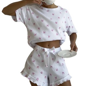 ロシアの新しい春夏カジュアルレディースホームリボンプリント半袖レースショーツ快適なパジャマセット