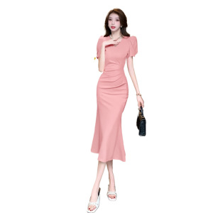 女性のための半袖ソリッドカラープリーツドレス 2025 夏の新しい V ネックウエストエレガントなヒップスカートフィッシュテールロングスカート