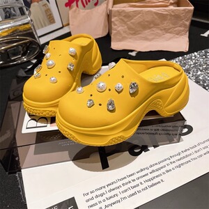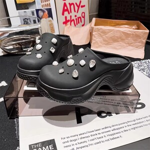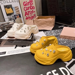 ビッグヘッドラインストーンリベットパールトゥハーフスリッパ厚底プラットフォーム下駄小さなビーチサンダル女性用