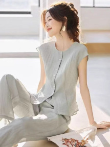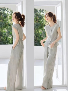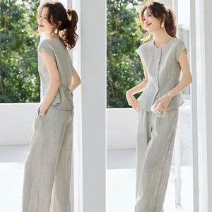 2025 夏の新韓国スタイルファッショナブルなノースリーブシャツトップスーツルーズカジュアルパンツツーピースセット女性のための