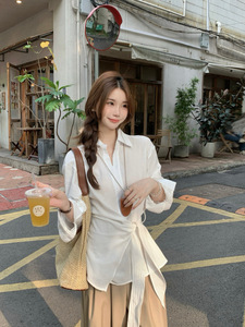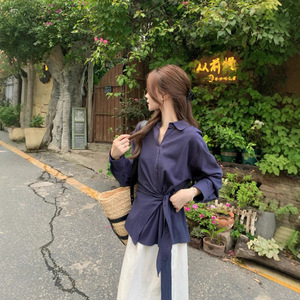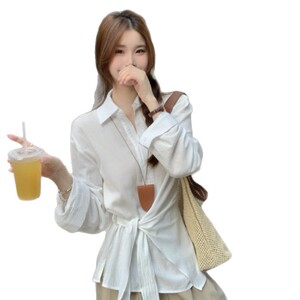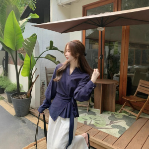 フレンチスタイルのリネンシャツ、韓国版2025年秋デザイン、イレギュラーな紐付きウエストマーク、オールドマネースタイルのゆったりとしたトップス