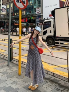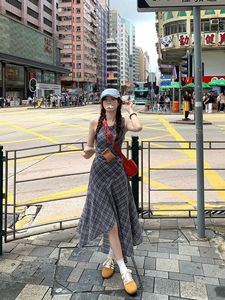 复古格子连衣裙女夏季气质收腰背心裙设计感小众不规则A字裙长裙
