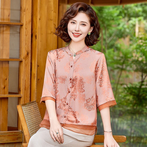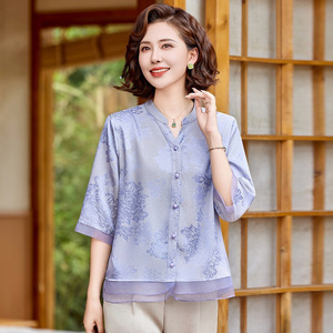 ドロップシッピング中年母親夏七分袖シャツ、洋風カーディガン、中高年女性の気質プリントトップス
