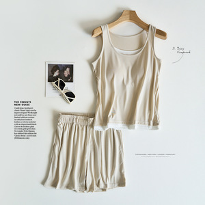 ココナッツオイルエコシルクアイスシルククールフェイクツーピースベストショーツトップ女性の夏のパジャマ胸パッドセット薄型