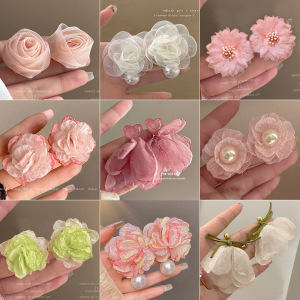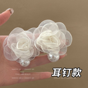 米白色雪纺花朵耳夹款