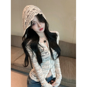 立体ストライプレースかぎ針編みフード付きカーディガン女性初秋の新しいスタイルファッショナブルなジャケットベルスリーブウエストトップ