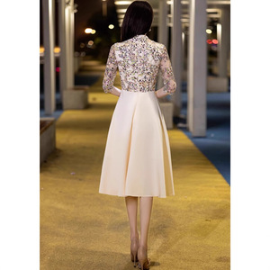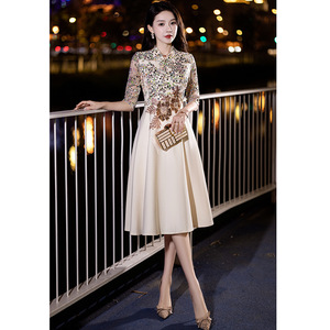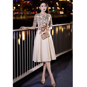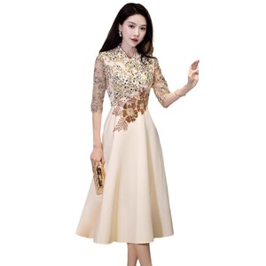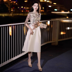 シャンパンカラーの母親のための結婚披露宴用イブニングドレス、女性用、2025年秋の新作、普段着としても着用可能、スパンコール付き中袖の宴会用ドレス