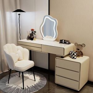奶油风梳妆台岩板实木床头柜一体网红伸妆台卧室现代简约梳妆柜