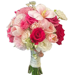 ウェディングピンクのウェディングブーケ、花嫁のブーケ、ウェディングチューリップ、証明書、造花、写真小道具