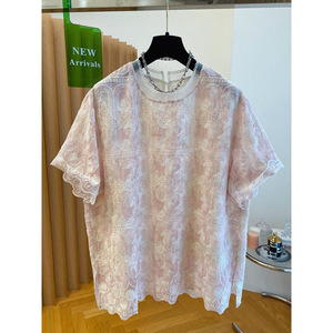 ブルー高级感レースブラウスレディース半袖トップス夏2025新作ゆるい刺繍ブラウスtシャツ洋風ブラウス