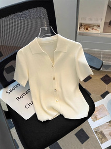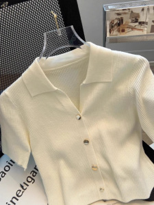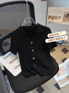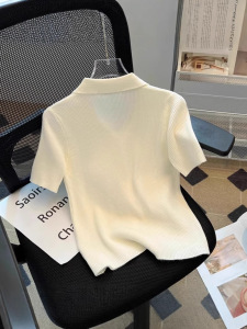 夏の新しいニッチでシックなファッショナブルなショートトップ韓国スタイルスリムポロカラー半袖ウールセーター女性用