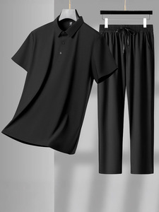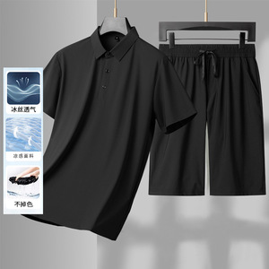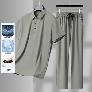 キツツキお父さんスーツ夏薄手半袖ストレッチ中年紳士アイスシルク服カジュアルスポーツ2点セット