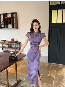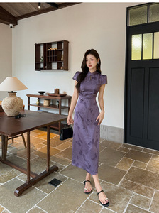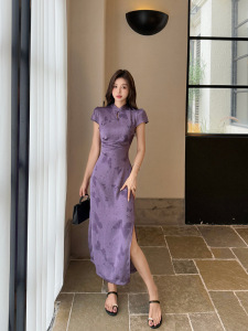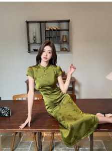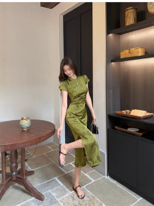 中国風の新しい中国風のサテン改良されたチャイナドレス、フェミニンでエレガントな蝶プリントのスリムフィットロングスカート