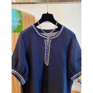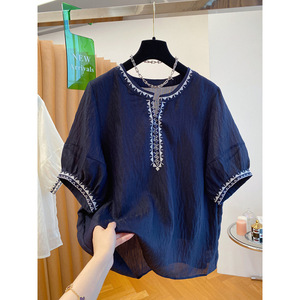 ボヘミアンエスニックスタイル刺繍シャツレディース半袖ルーズ薄手ラウンドネックシャツテンセルベビードールシャツトップ夏