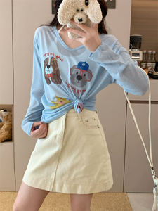 新しい女性用日焼け止め服、夏の年齢軽減漫画プリント長袖Tシャツ、女性用のゆったりとした甘いスタイルのVネック日焼け止めブラウストップ
