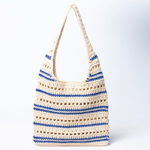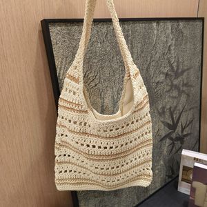 新しいストライプ柄の綿糸草編みバッグ、手編みバッグ、ショルダーバッグ、ハンドバッグ、大容量、休暇、ビーチ、トートバッグ、女性用
