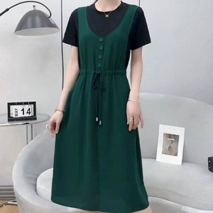 偽ツーピースファッショナブルな年齢軽減ドレス新しい半袖トップスラウンドネックインターネットセレブホットスタイルミドル丈スカート女性のトレンド