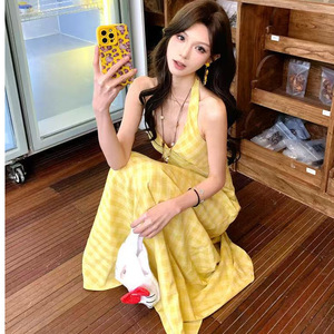 黄色格子V领挂脖吊带连衣裙女夏季多巴胺绝美修身温柔度假风长裙