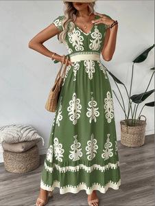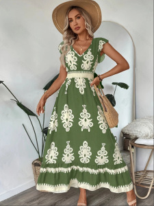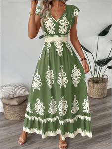 女性の気質 V ネック半袖ロングスカートフレッシュグリーンボヘミアンホリデースタイルドレス