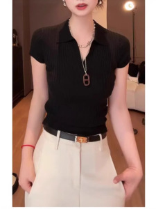 やせて見えるスリムな襟付きニット半袖tシャツ女性2025夏の新しい高級感のある雰囲気に合わせて短い上着を着る