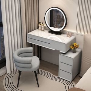 奶油风梳妆台现代简约轻奢岩板书桌实木化妆台一体卧室化妆桌